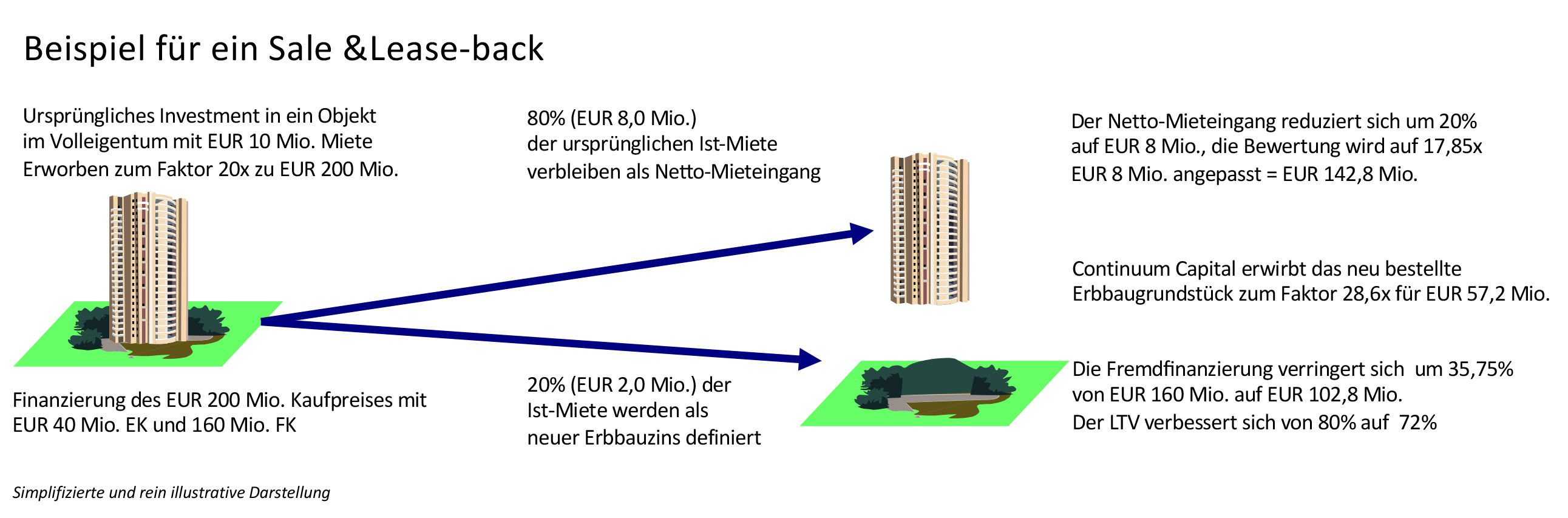 Durch die Bestellung und die darauf folgende Veräußerung des neu geschaffenen Erbbaugrundstücks erschließen sich für den bisherigen Eigentümer der Gesamtimmobilie Möglichkeiten, zum einen Eigenkapital freizusetzen, zum anderen die bestehende Verschuldung bei den Banken überproportional zum bestellten Erbbauzins zurückzuführen.